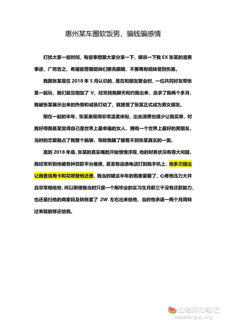 打扰大家一些时间,有些事想跟大家分享一下,倾诉一下我 EX 惠州某车圈张某的渣男