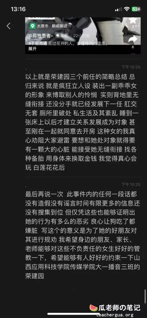 山西应用科技大学传媒学院大一新生荣建园,长期劈腿出轨,对外人设完美无瑕,实则喜欢玩弄感情,同时交往多人,只为满足自己的拜金和欲望。