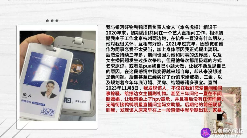 杭州鸭鸭直播间负责人余人,毫无底线的渣男,长期PUA女主,婚后家暴,孕期出轨,还是个嫖虫