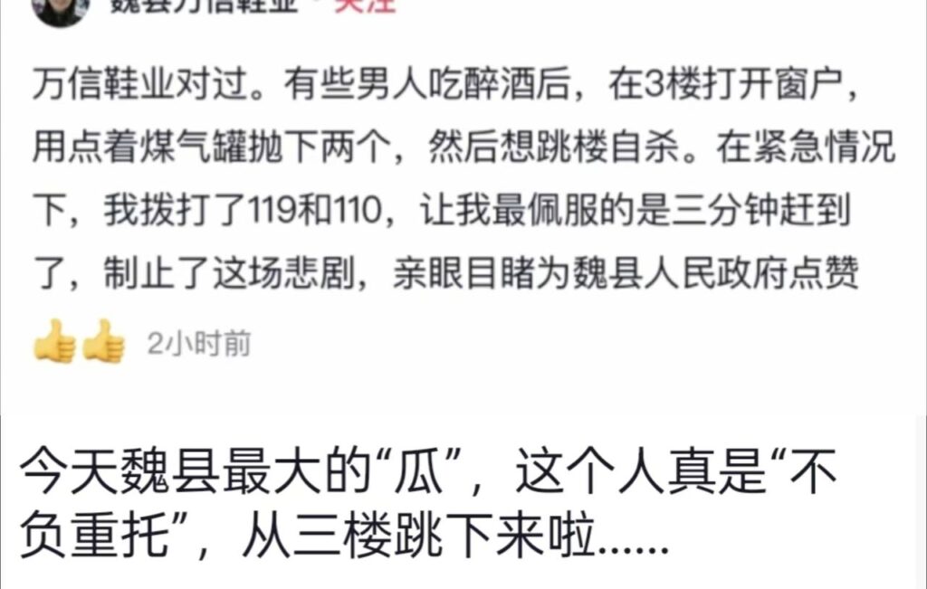 邯郸魏县闹市区惊魂一幕!万信鞋店对过不明醉酒男子高空投掷煤气罐