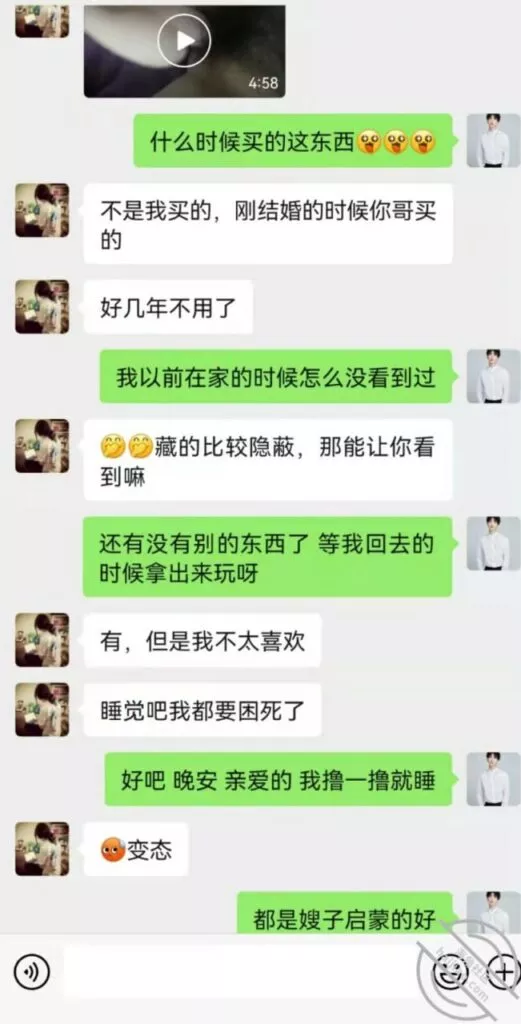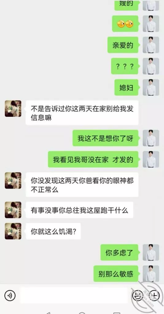 这么长时间嫂子第一次给我发了两张漏扔自拍照!搔嫂子,我要是把这些聊天记录发给我哥会怎么样!期间还给我发了视频,我没接,也没法接!接了视频一看是我全露馅了!语音这么长时间我都没敢发过!!!