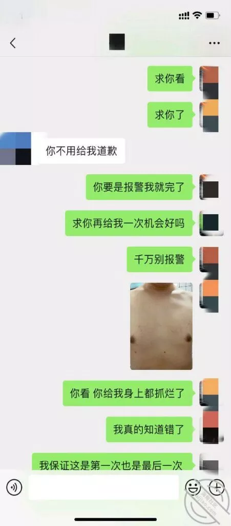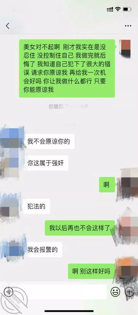 我回家就赶紧微信给她道歉,希望她当做没发生,能原谅我,谁知道她坚决要去报警,我不停的给她道歉认错,她就是不理我