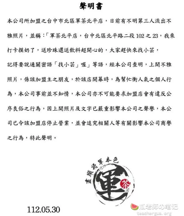 日前台湾台中市连锁饮品店「军茶」北平店火了,据悉是因为开业时一名 Twitter 女网红前往该店进行 “摊贩露出” 活动,并有男网友上传女网红露扔照,称 “军茶北平店,我来打卡摸扔了,送珍珠还送饮料超开心,大家赶快来找小芸,记得要说通关密语,‘找小芸’喔!”、还有网民分享心得 “有摸到扔超开心的!” 等语。